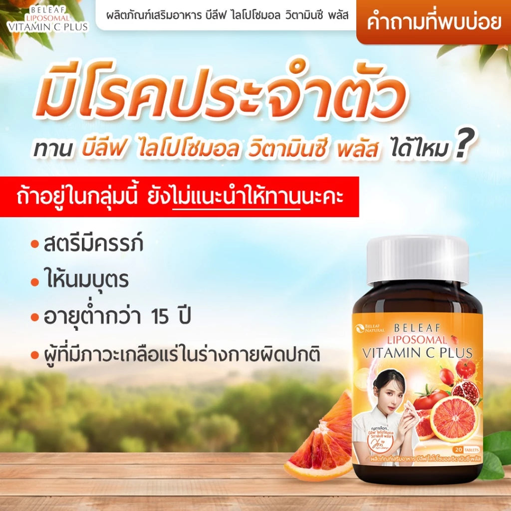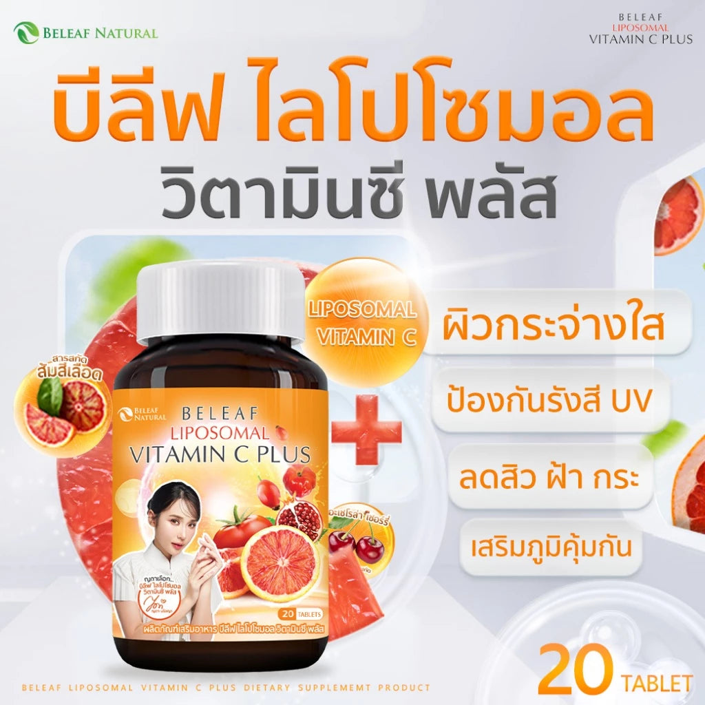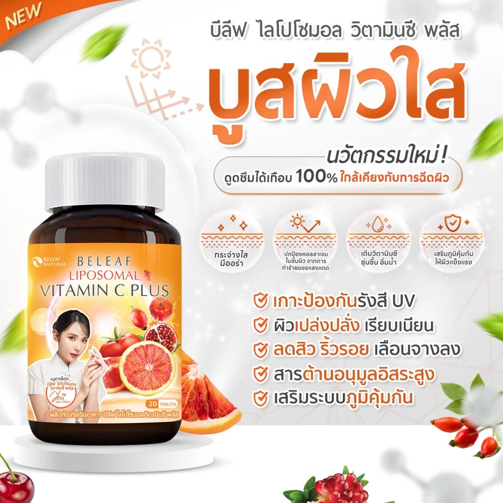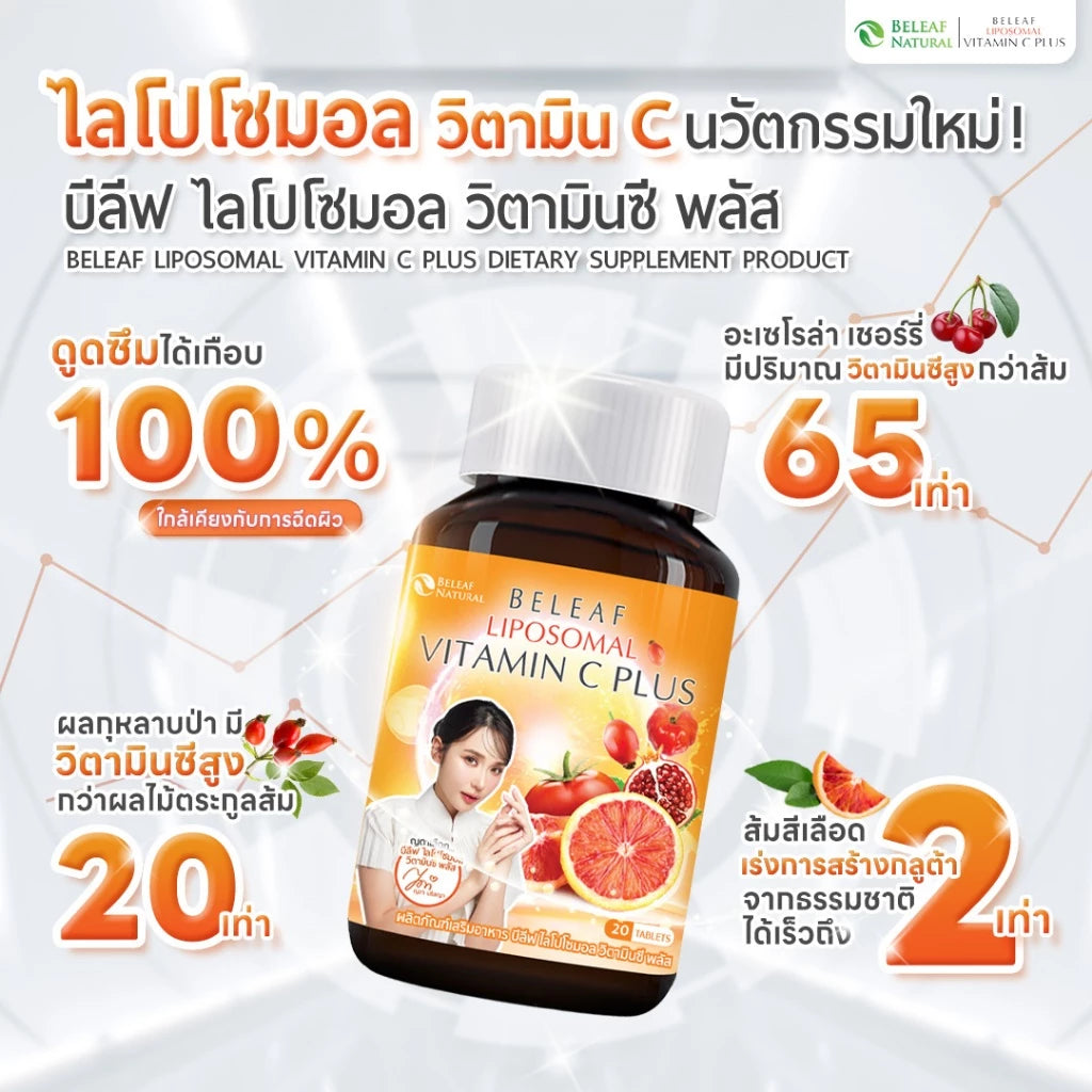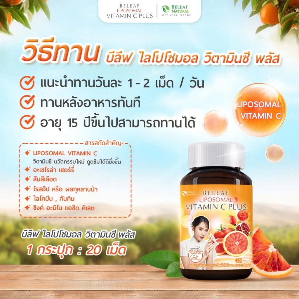 Beleaf Liposomal Vitamin C Plus ผลิตจากประเทศไทย ใช้เทคโนโลยีไลโปโซมอลเพื่อช่วยให้ร่างกายดูดซึมสารอาหารได้อย่างมีประสิทธิภาพ ผสานวิตามินซีและสารอาหารที่มีคุณสมบัติต้านอนุมูลอิสระ เพื่อช่วยคงการทำงานตามปกติของร่างกาย