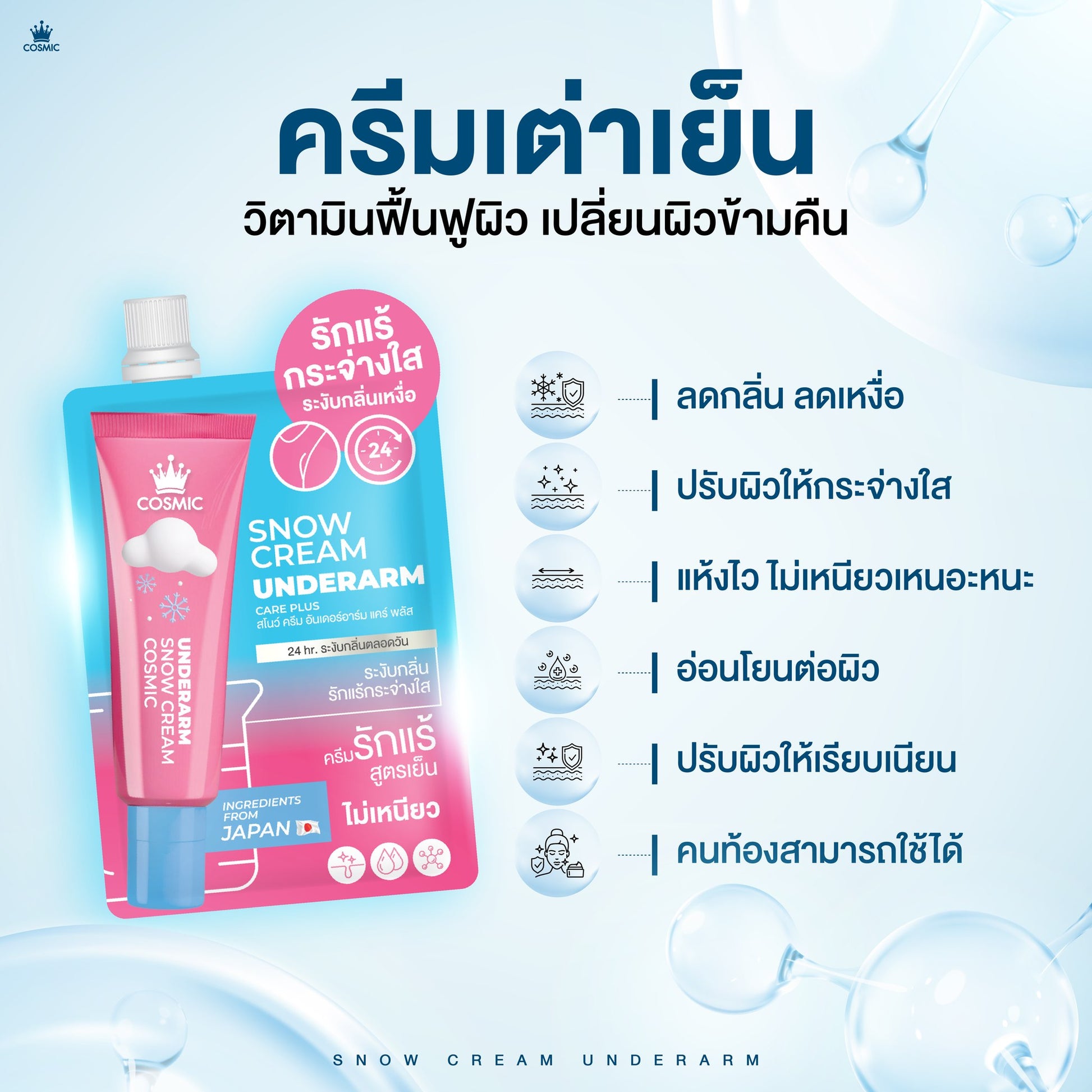 บอกลาปัญหารักแร้หมอง กลิ่นแรง เหงื่อเยิ้ม ด้วย ครีมเต่าเย็น COSMIC Snow Cream Underarm ครีมบำรุงใต้วงแขนเนื้อเย็นสดชื่น ที่ช่วยลดเหงื่อ ลดกลิ่น และปรับผิวใต้วงแขนให้กระจ่างใสขึ้นอย่างเป็นธรรมชาติ เย็นจริง หอมสะอาด ให้ความมั่นใจทุกการยกแขน