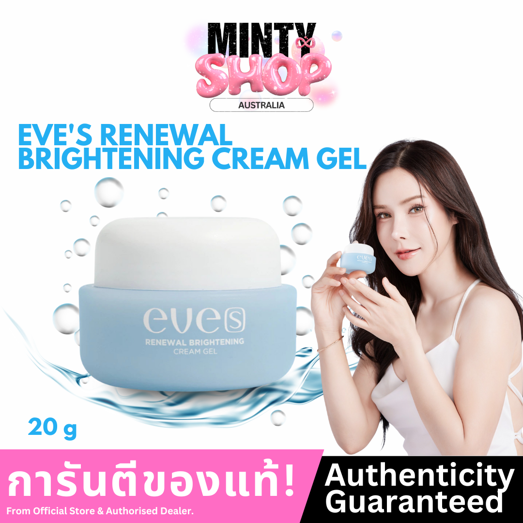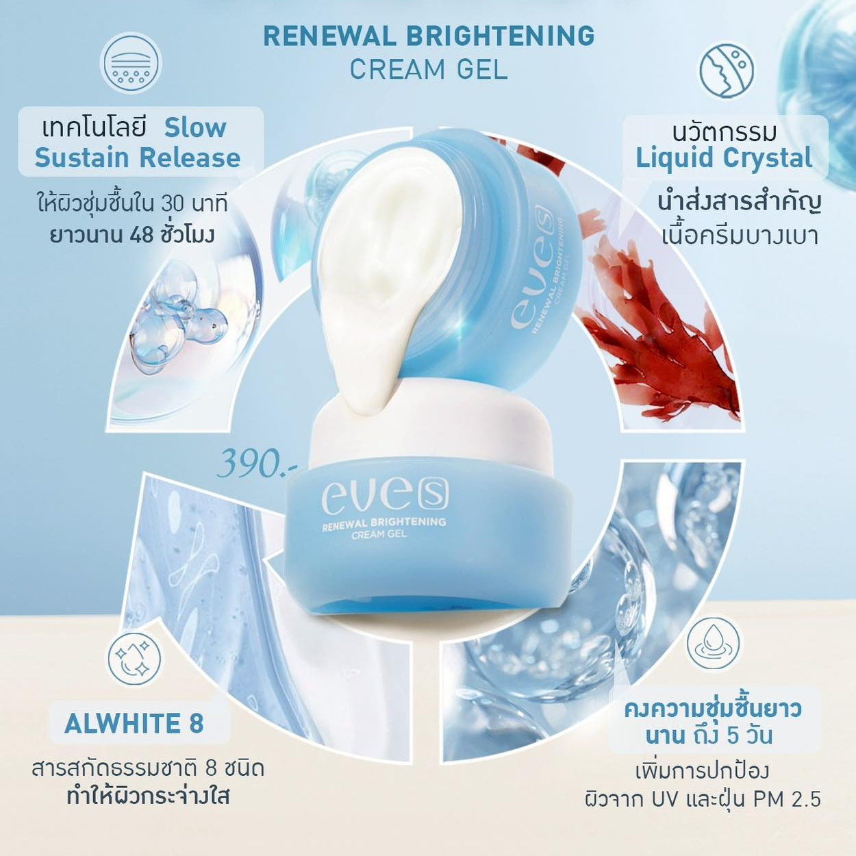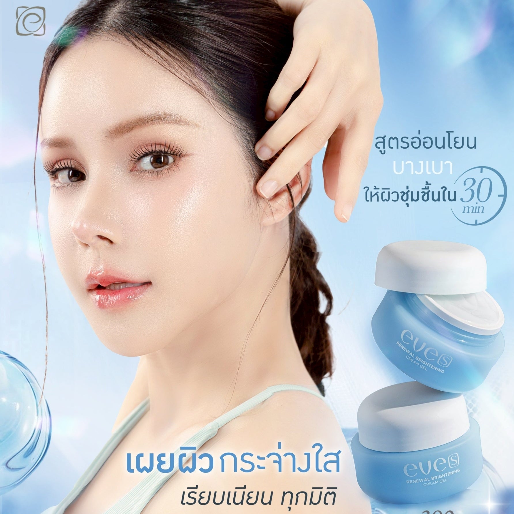 EVE’S Renewal Brightening Cream Gel 20g ครีมเจลบำรุงผิวหน้าเนื้อบางเบา ซึมซาบเร็ว มอบความชุ่มชื้นยาวนานและความกระจ่างใสอย่างเป็นธรรมชาติ ช่วยลดเลือนฝ้า กระ จุดด่างดำ และสีผิวไม่สม่ำเสมอ พร้อมล็อคความชุ่มชื้นให้ผิวอิ่มน้ำ ดูสุขภาพดี เนื้อครีมไม่เหนียวเหนอะหนะ เหมาะสำหรับทุกสภาพผิว รวมถึงผิวบอบบาง ขนาดกะทัดรัด เหมาะสำหรับพกพาและใช้เป็นประจำทุกวัน เพื่อผิวเรียบเนียน กระจ่างใส และมีชีวิตชีวา