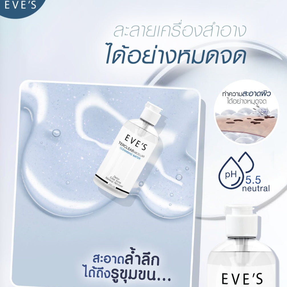 EVE’S Ter Clear Micellar Cleansing Water 200ml คลีนซิ่งเช็ดทำความสะอาดผิวหน้าสูตรอ่อนโยน เหมาะสำหรับทุกสภาพผิว รวมถึงผิวบอบบางและมีแนวโน้มเป็นสิวง่าย ด้วยเทคโนโลยี Micellar ทำงานเสมือนแม่เหล็ก ดึงสิ่งสกปรก เครื่องสำอาง และความมันส่วนเกินออกจากผิวอย่างหมดจด แม้เมคอัพกันน้ำ พร้อมสารสกัดทีทรีออยล์จากธรรมชาติ มอบความสดชื่นและช่วยให้ผิวสมดุล ไม่แห้งตึง และไม่ทิ้งคราบมัน เพื่อผิวสะอาดพร้อมรับการบำรุงในขั้นตอนต่อไป