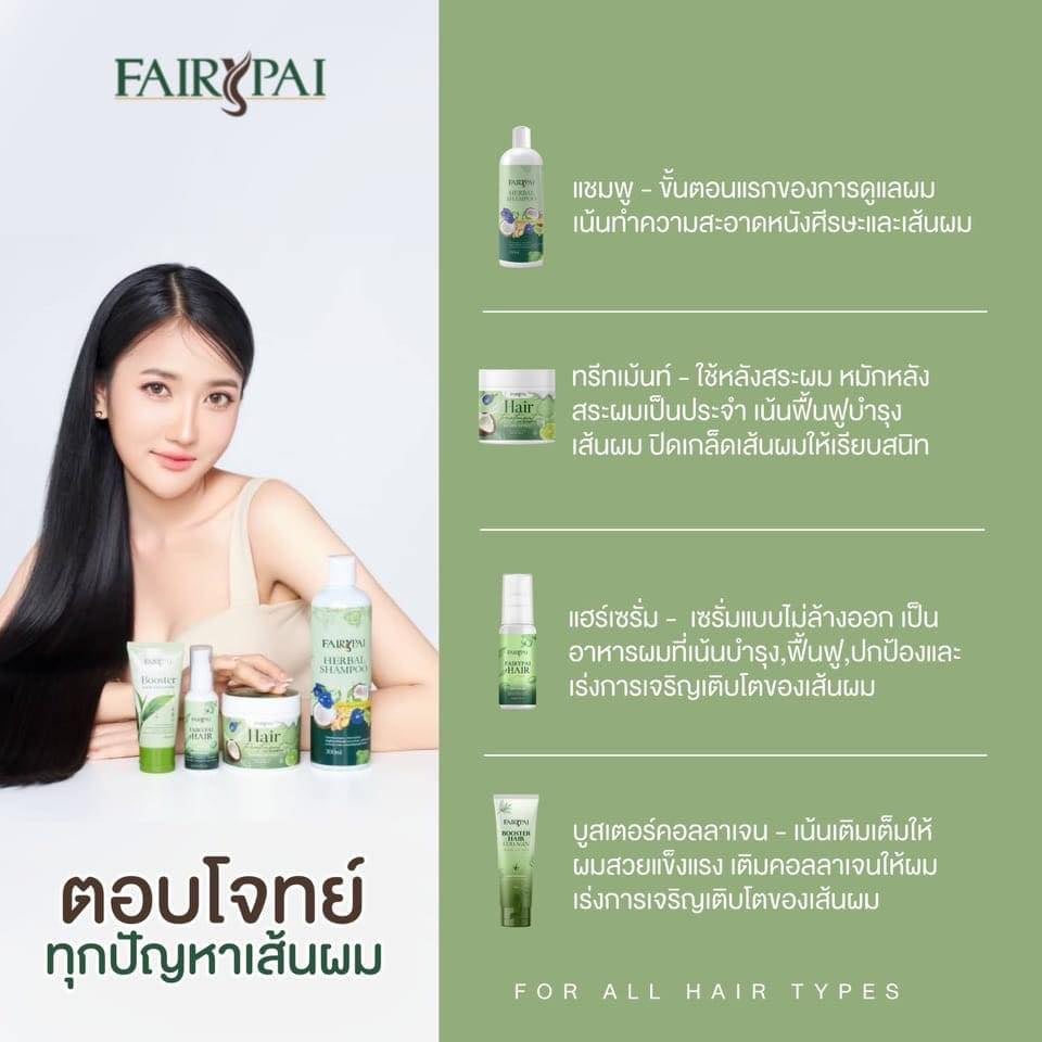 Fairypai Hair Care Collection ผลิตภัณฑ์ดูแลเส้นผมครบชุด เพื่อผมสุขภาพดี สวยแข็งแรง ตั้งแต่โคนจรดปลาย ประกอบด้วย แชมพูล้างทำความสะอาดล้ำลึก ดีท็อกซ์หนังศีรษะและเส้นผม ทรีตเมนต์ฟื้นฟูผมเสีย เซรั่มเร่งการเจริญเติบโตและปกป้องผม และบูสเตอร์คอลลาเจนเติมความชุ่มชื้นและความเงางาม สูตรนี้ช่วยลดการขาดหลุดร่วง ขจัดรังแค ฟื้นฟูผมที่ผ่านการทำเคมี และเพิ่มความแข็งแรง เงางามอย่างเป็นธรรมชาติ เหมาะกับทุกสภาพผม รวมถึงผมที่ผ่านการทำสีหรือดัด