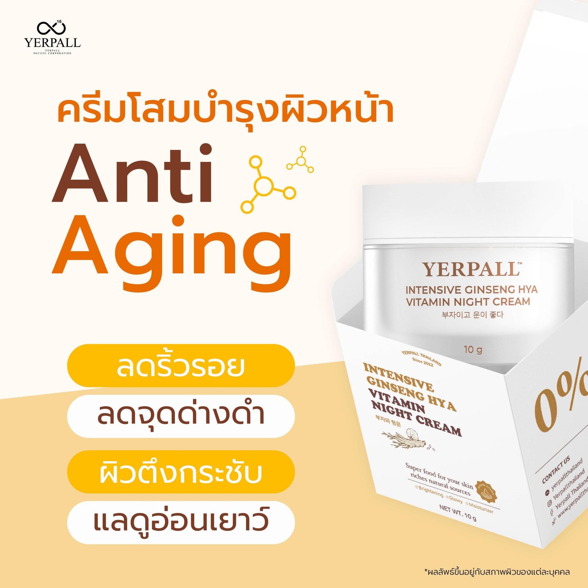 เยอร์พอล อินเท็นซีฟ จินเซง ไฮยา วิตามิน ไนท์ ครีม ขนาด 10 กรัม ไนท์ครีมสไตล์เกาหลีที่ผสานคุณค่าจากโสมและอนุพันธ์ไฮยา 4 โมเลกุล เพื่อเติมความชุ่มชื้น บำรุงผิวให้เนียนนุ่ม กระชับ และช่วยให้ผิวแลดูกระจ่างใสขึ้น พร้อมแถมมาส์กดีท็อกซ์ผิว 1 ซอง