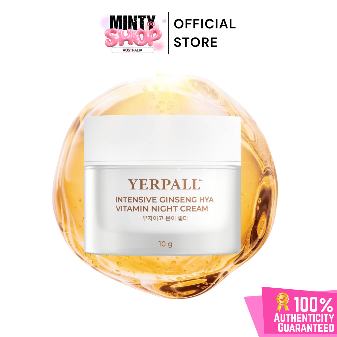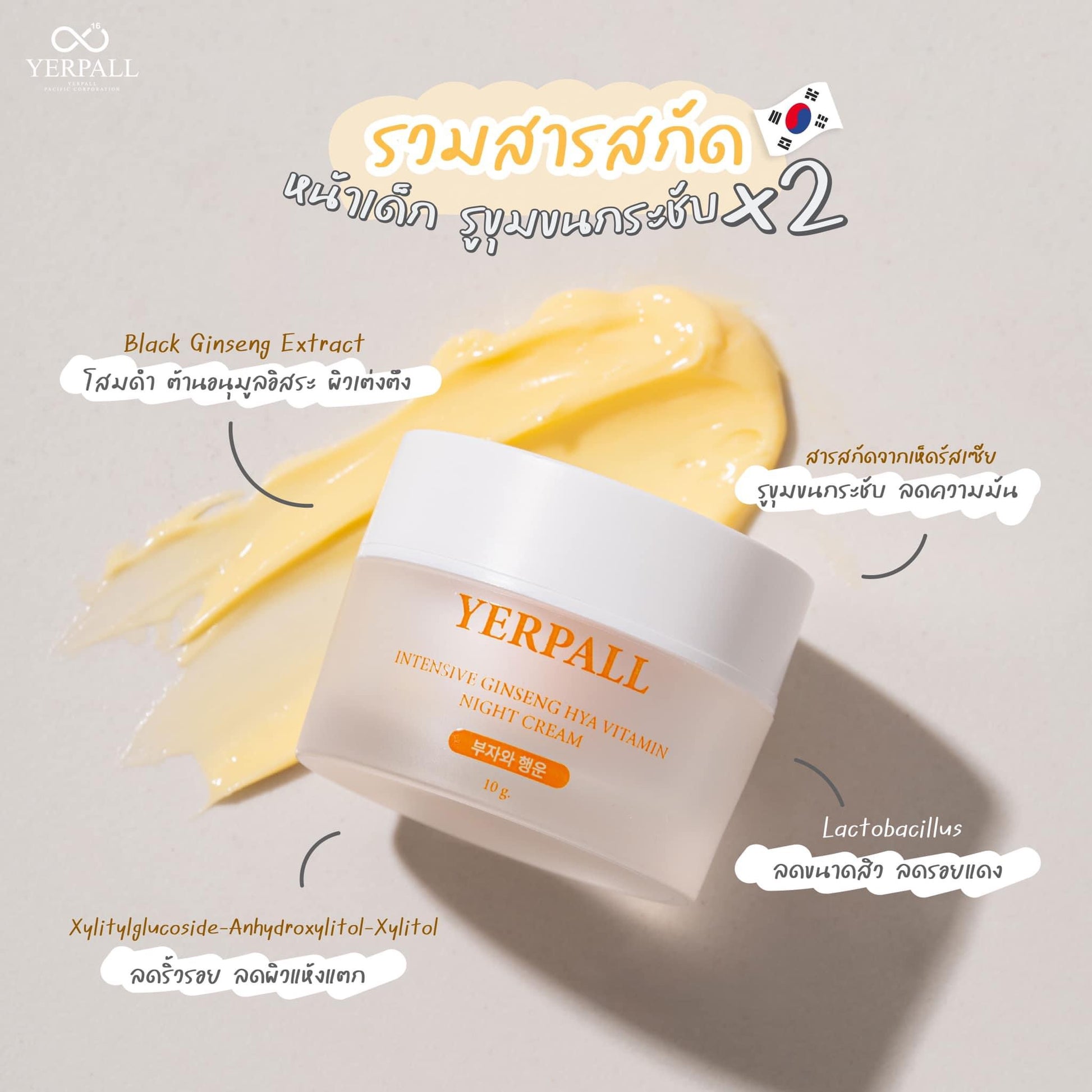 เยอร์พอล อินเท็นซีฟ จินเซง ไฮยา วิตามิน ไนท์ ครีม ขนาด 10 กรัม ไนท์ครีมสไตล์เกาหลีที่ผสานคุณค่าจากโสมและอนุพันธ์ไฮยา 4 โมเลกุล เพื่อเติมความชุ่มชื้น บำรุงผิวให้เนียนนุ่ม กระชับ และช่วยให้ผิวแลดูกระจ่างใสขึ้น พร้อมแถมมาส์กดีท็อกซ์ผิว 1 ซอง
