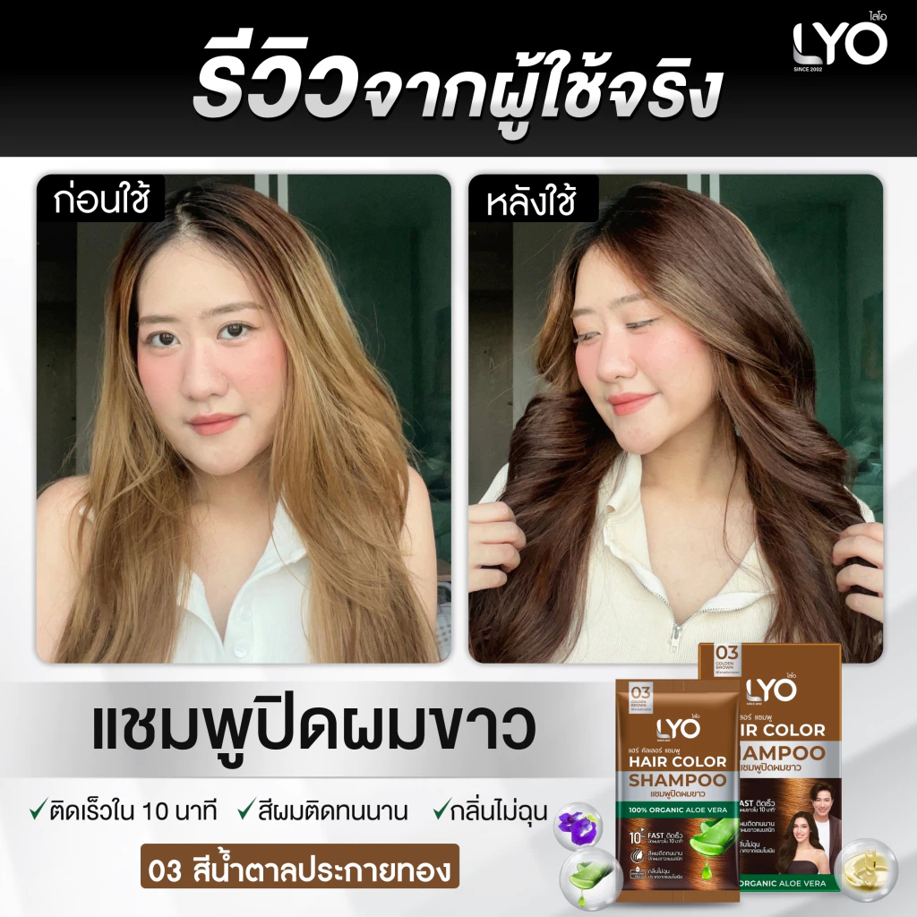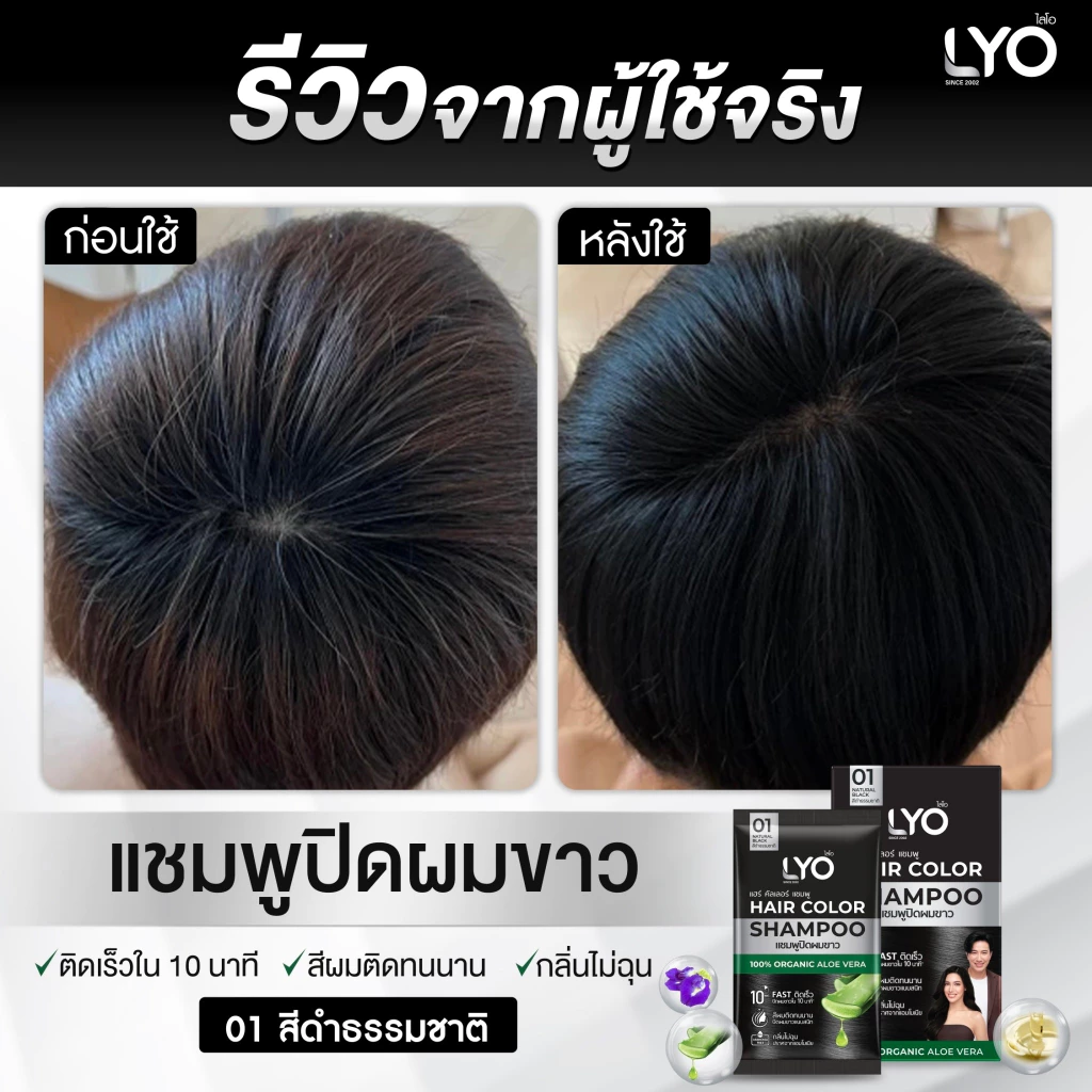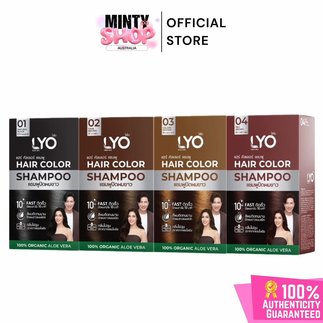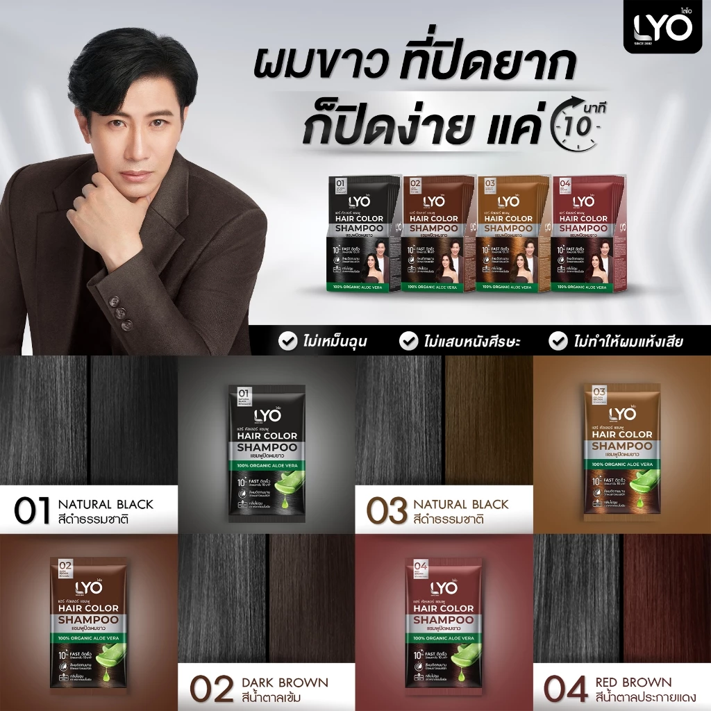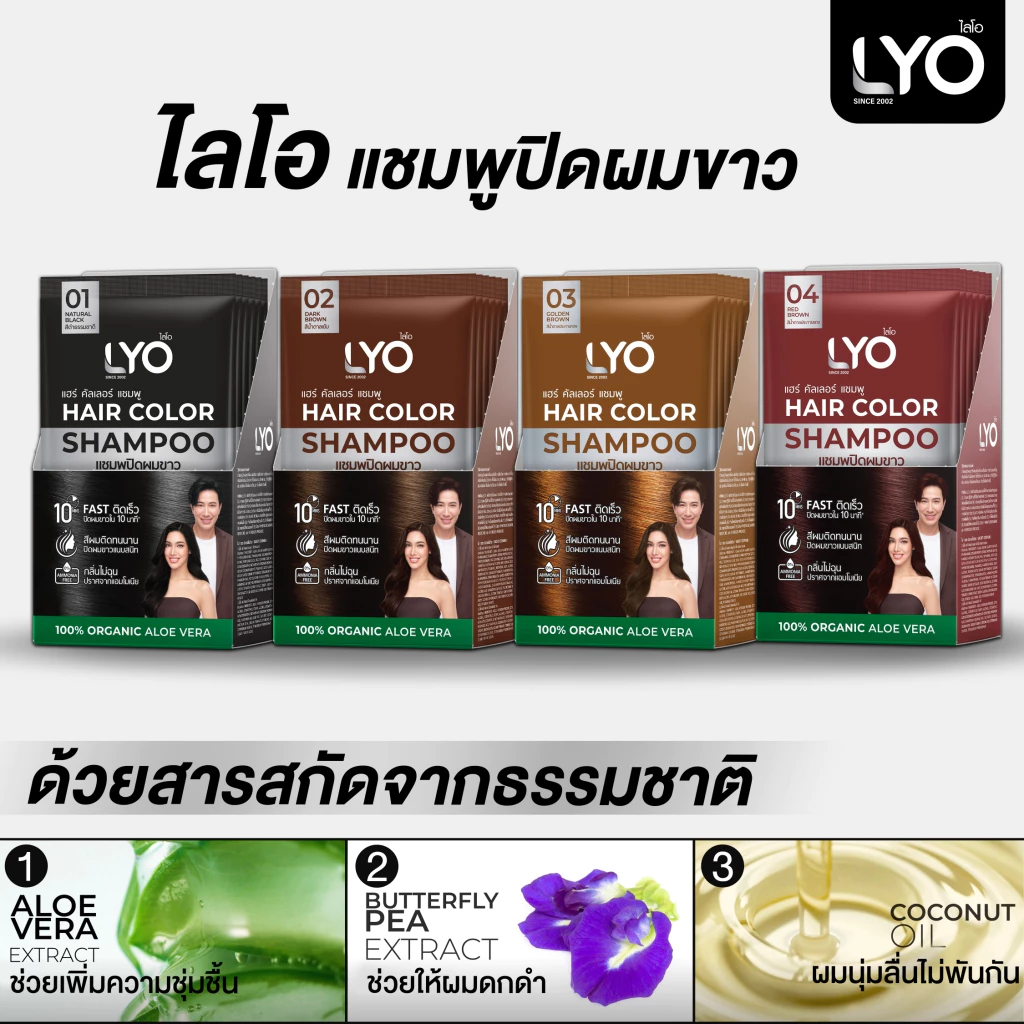 LYO แฮร์ คัลเลอร์ แชมพู แชมพูปิดผมขาวที่ใช้สะดวก ให้สีผมดูเป็นธรรมชาติภายใน 10 นาที ผสานสารสกัดจากว่านหางจระเข้ อัญชัน และน้ำมันมะพร้าว ช่วยบำรุงเส้นผมให้นุ่มสลวย เงางาม ไม่แห้งเสีย พร้อมเทคโนโลยี CHROMAPOL COLORPOP จากสหรัฐอเมริกา ล็อกสีผมให้ติดทนนาน แม้สระบ่อยได้ถึง 30 ครั้ง มีให้เลือก 4 เฉดสี: