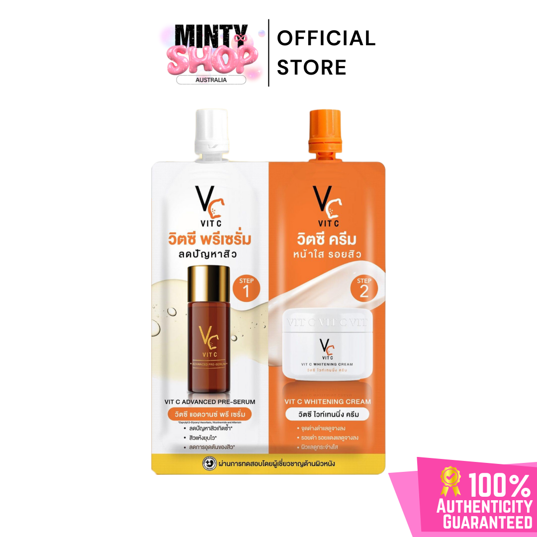 VC Vit C Bio Face Advanced Pre-Serum & Whitening Cream (8g) is a 2-in-1 sachet skincare duo designed for convenience and daily use. The first step, Vitamin C Advanced Pre-Serum, is a lightweight essence that helps refresh skin and prepare it for deeper nourishment. The second step, Vitamin C Whitening Cream, is enriched with concentrated actives to support a brighter, more even-looking complexion while providing lightweight hydration. The dual sachet format makes it easy to carry, hygienic, and suitable for most skin types.
