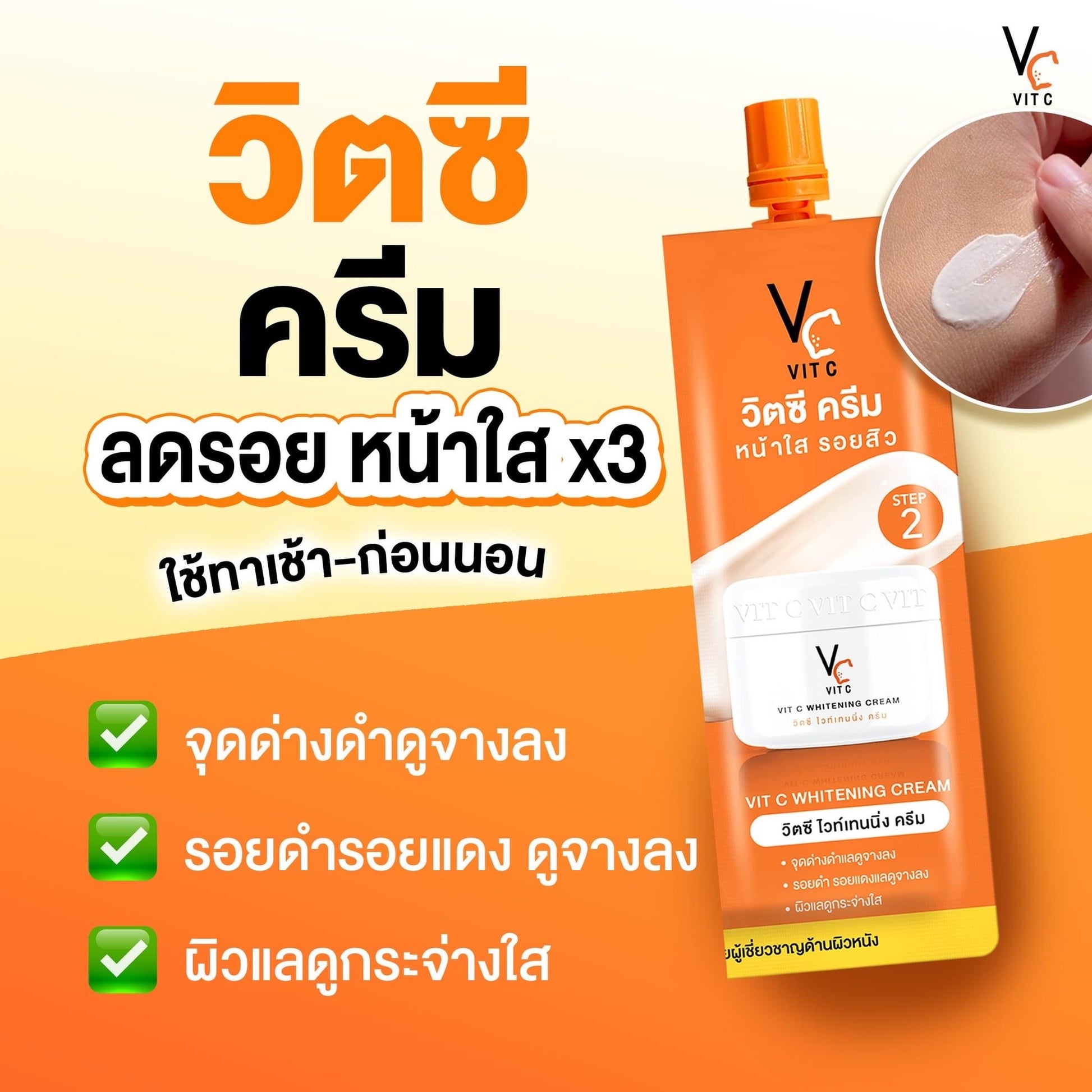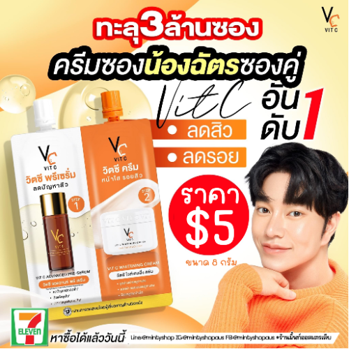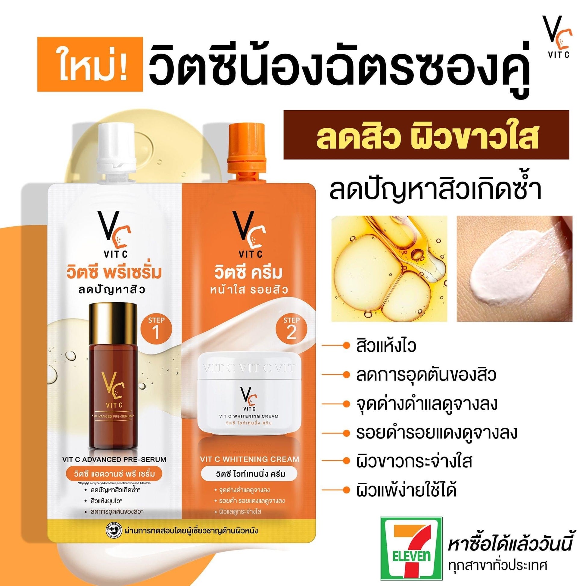VC Vit C Bio Face Advanced Pre-Serum & Whitening Cream (8 กรัม) สกินแคร์แบบซอง 2in1 ใช้ง่ายและสะดวกต่อการพกพา ขั้นตอนแรกคือวิตซีแอดวานซ์ พรีเซรั่ม เนื้อน้ำตบเบาสบาย ช่วยเตรียมผิวให้พร้อมรับการบำรุง ขั้นตอนที่สองคือวิตซีครีมสูตรเข้มข้น ช่วยบำรุงให้ผิวดูกระจ่างใสและสีผิวดูสม่ำเสมอ พร้อมเติมความชุ่มชื้นอย่างอ่อนโยน เหมาะกับการใช้เป็นประจำทุกวัน
