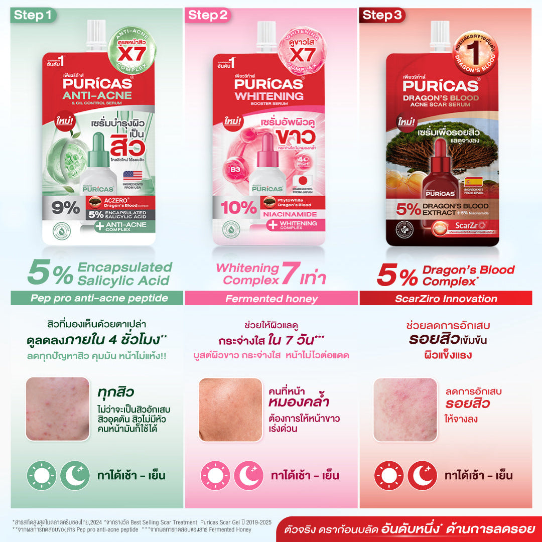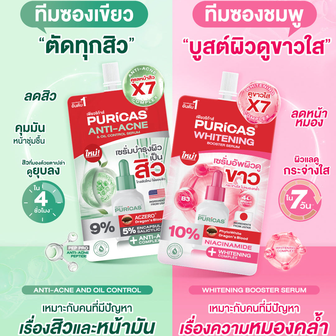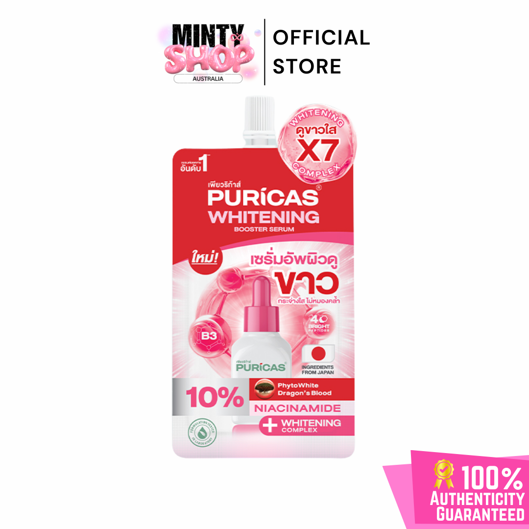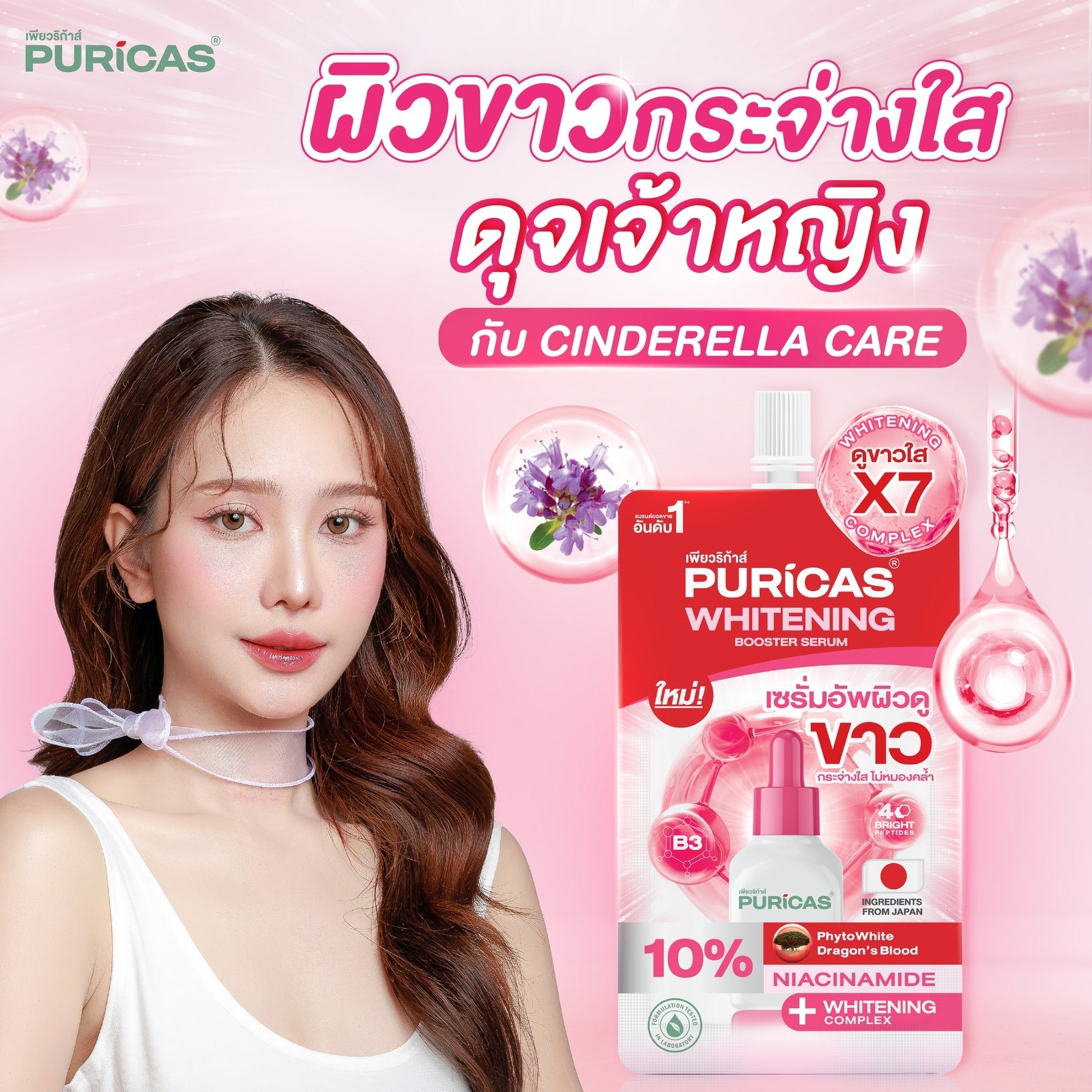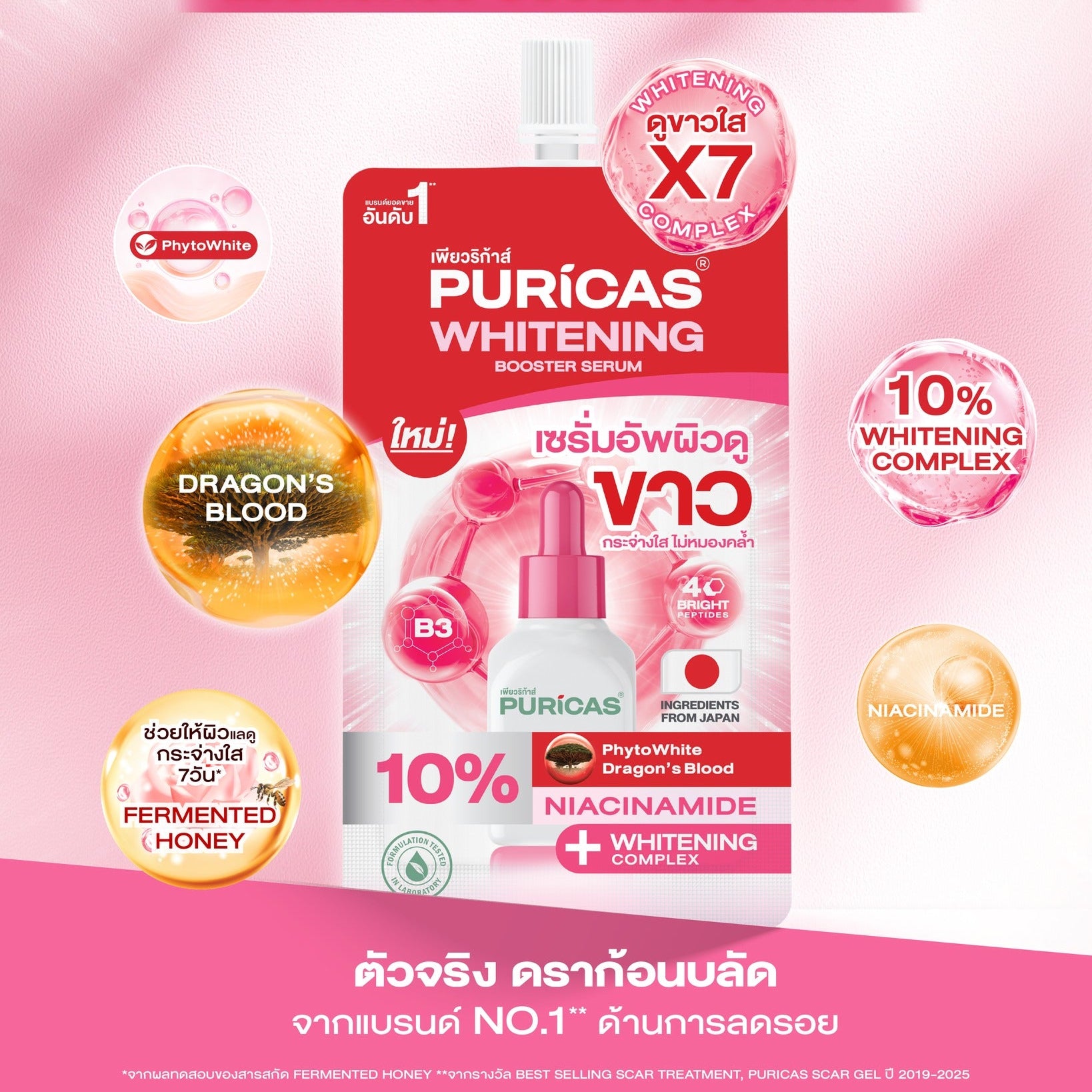 Puricas Whitening Booster Serum 7ml เซรั่มบำรุงผิวหน้าเพื่อผิวแลดูกระจ่างใส ช่วยลดความหมองคล้ำและปรับสีผิวให้สม่ำเสมอ ด้วยเทคโนโลยีไวท์เทนนิ่งและสารสกัดธรรมชาติ เนื้อบางเบา ซึมซาบเร็ว ใช้ง่าย เหมาะสำหรับใช้เป็นประจำทุกเช้าและก่อนนอน