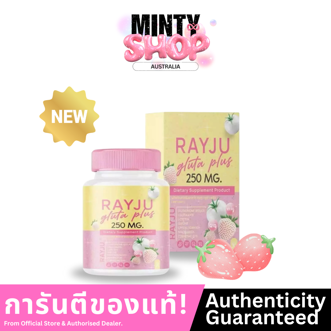 RAYJU Gluta Plus ชนิดเม็ดเคี้ยว 30 เม็ด อาหารเสริมรสนมสตรอเบอร์รี่ ช่วยบำรุงผิวให้กระจ่างใส ลดรอยดำ ริ้วรอย พร้อมเพิ่มความชุ่มชื้นให้ผิวแลดูสุขภาพดี เคี้ยวง่าย อร่อย ไม่คาว
