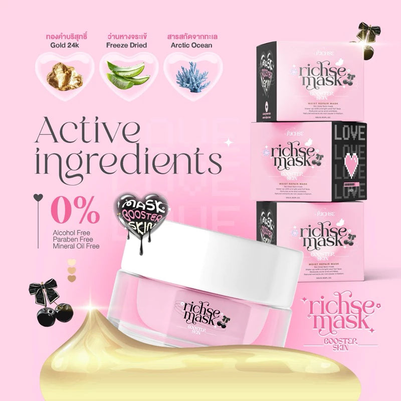RICH SE Mask Booster Skin มาสก์บำรุงผิวหน้าเนื้อเข้มข้น ผสานสารสกัดจากแพลงก์ตอนทะเลลึก (Arctalis™) และ Hexapeptide-2 ช่วยปรับสมดุลผิว ลดเลือนฝ้า กระ จุดด่างดำ พร้อมปรับสีผิวให้สม่ำเสมอ แลดูสว่างกระจ่างใส เติมเต็มด้วย Pearl Protein และ Colloidal Platinum ฟื้นบำรุงผิวหมองคล้ำ ให้ผิวเนียนนุ่ม ชุ่มชื้น และแลดูเปล่งประกายสุขภาพดี เหมาะสำหรับทุกสภาพผิว รวมถึงผิวบอบบางแพ้ง่าย