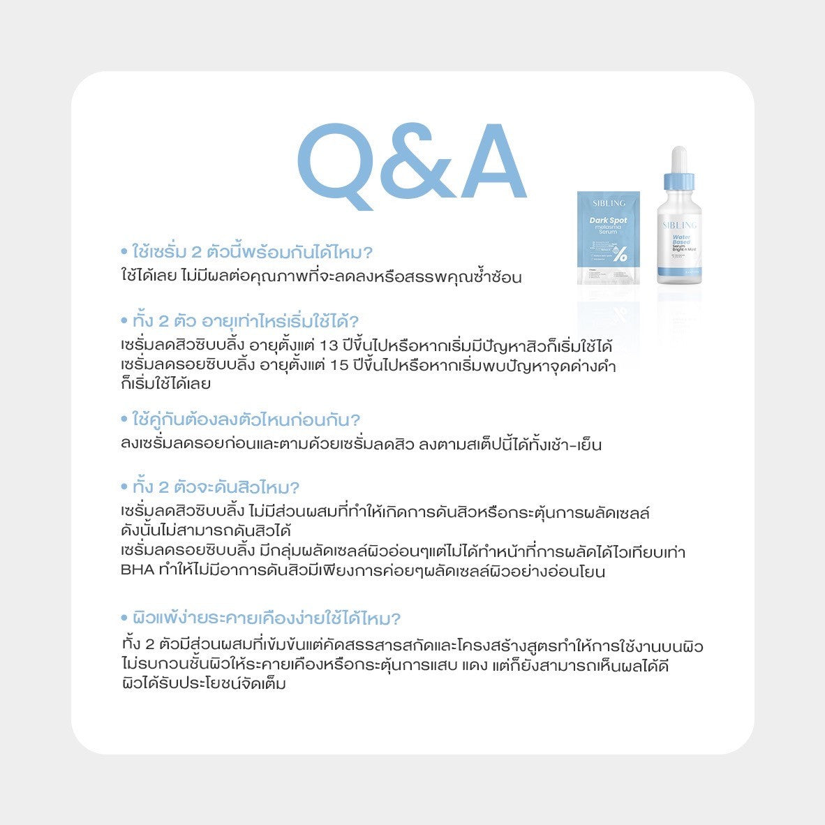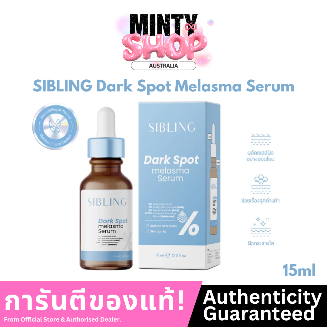 ซิบบลิ้ง ดาร์กสปอต เมลาสมา เซรั่ม 15 มล. เซรั่มบำรุงผิวหน้าสูตรบางเบา สำหรับผิวที่มีรอยสิว ฝ้า กระ และจุดด่างดำต่างๆ อุดมด้วยส่วนผสม Tranexamic Acid, Acetyl Glucosamine (NAG), PHA และสารสกัด Melazero ช่วยผลัดเซลล์ผิวอย่างอ่อนโยน พร้อมปรับผิวให้ดูกระจ่างใสอย่างเป็นธรรมชาติ เนื้อซึมซาบเร็ว ไม่เหนอะหนะ เหมาะสำหรับใช้เป็นประจำทุกวัน