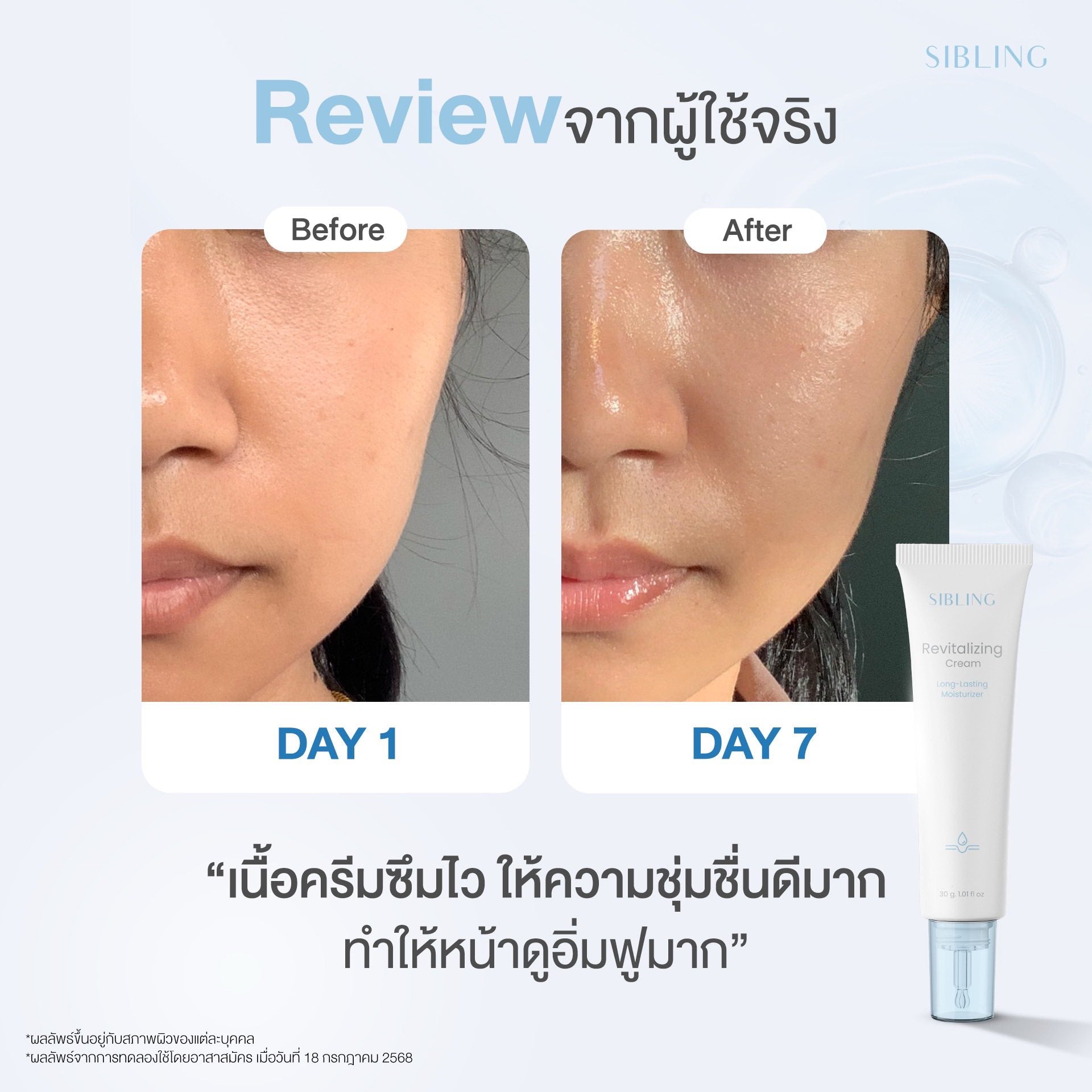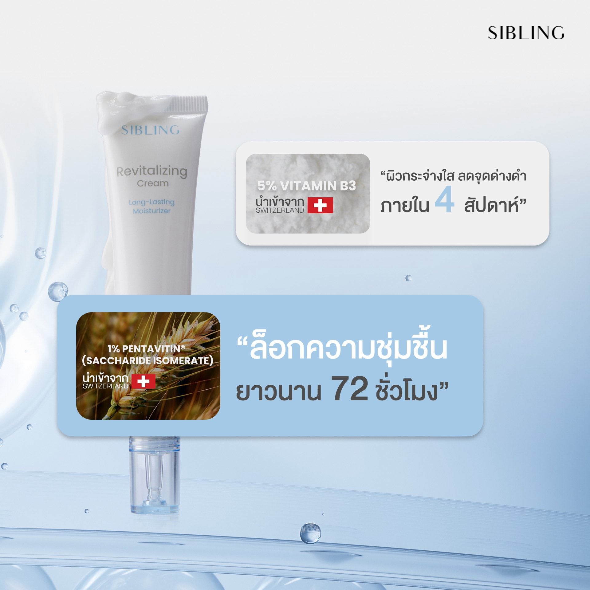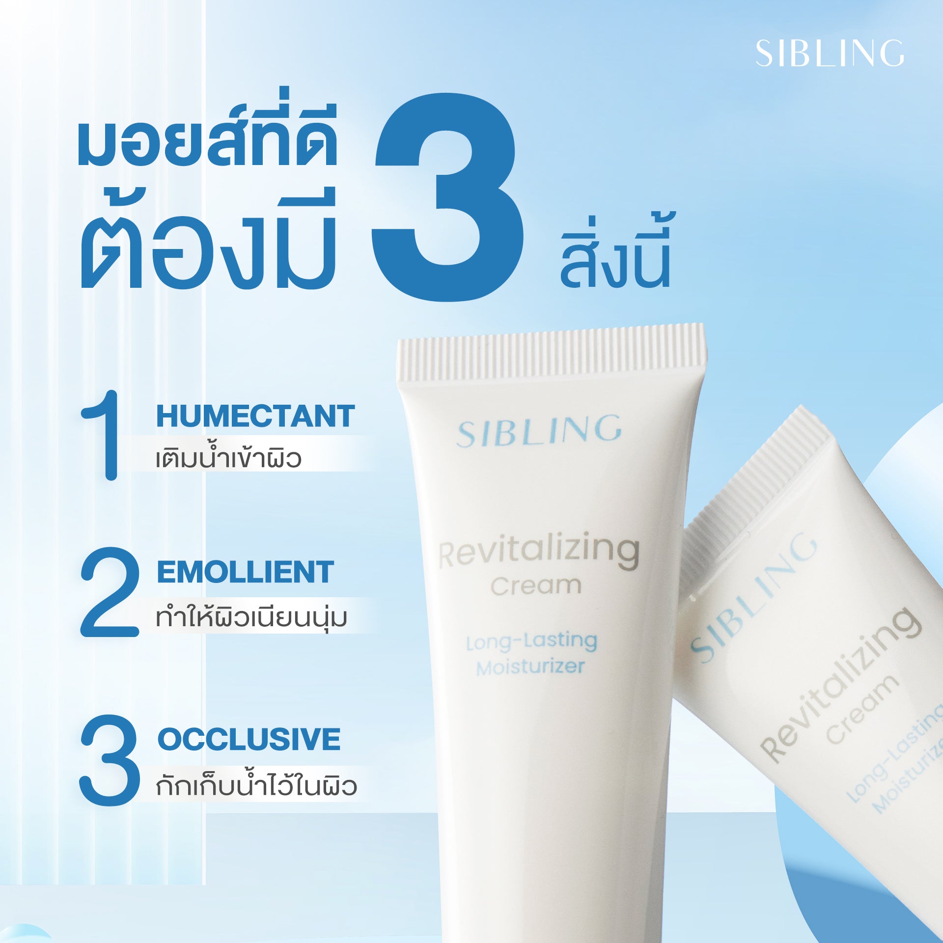 ซิบบลิ้ง รีไวทัลไลซิ่ง ครีม 15 กรัม มอยส์เจอไรเซอร์บำรุงผิวสูตรเข้มข้น มอบความชุ่มชื้นยาวนานสูงสุด 72 ชั่วโมง ด้วยส่วนผสมเซราไมด์ วิตามินบี 3 และซัคคาไรด์ ไอโซเมอเรท ช่วยเสริมเกราะป้องกันผิว ให้ผิวแข็งแรง ลดการระคายเคือง เนื้อครีมบางเบา ซึมเร็ว ไม่เหนอะหนะ เหมาะกับทุกสภาพผิว