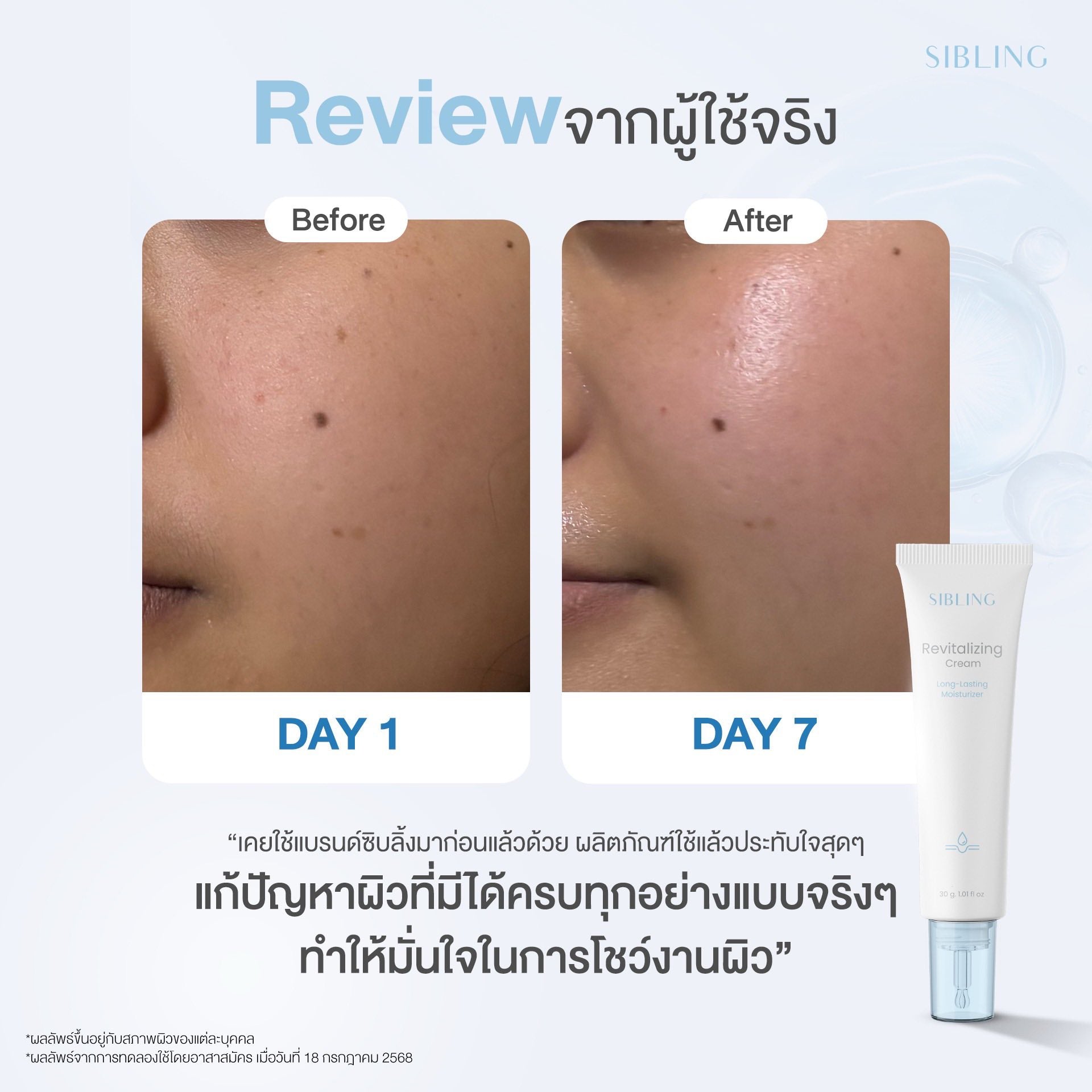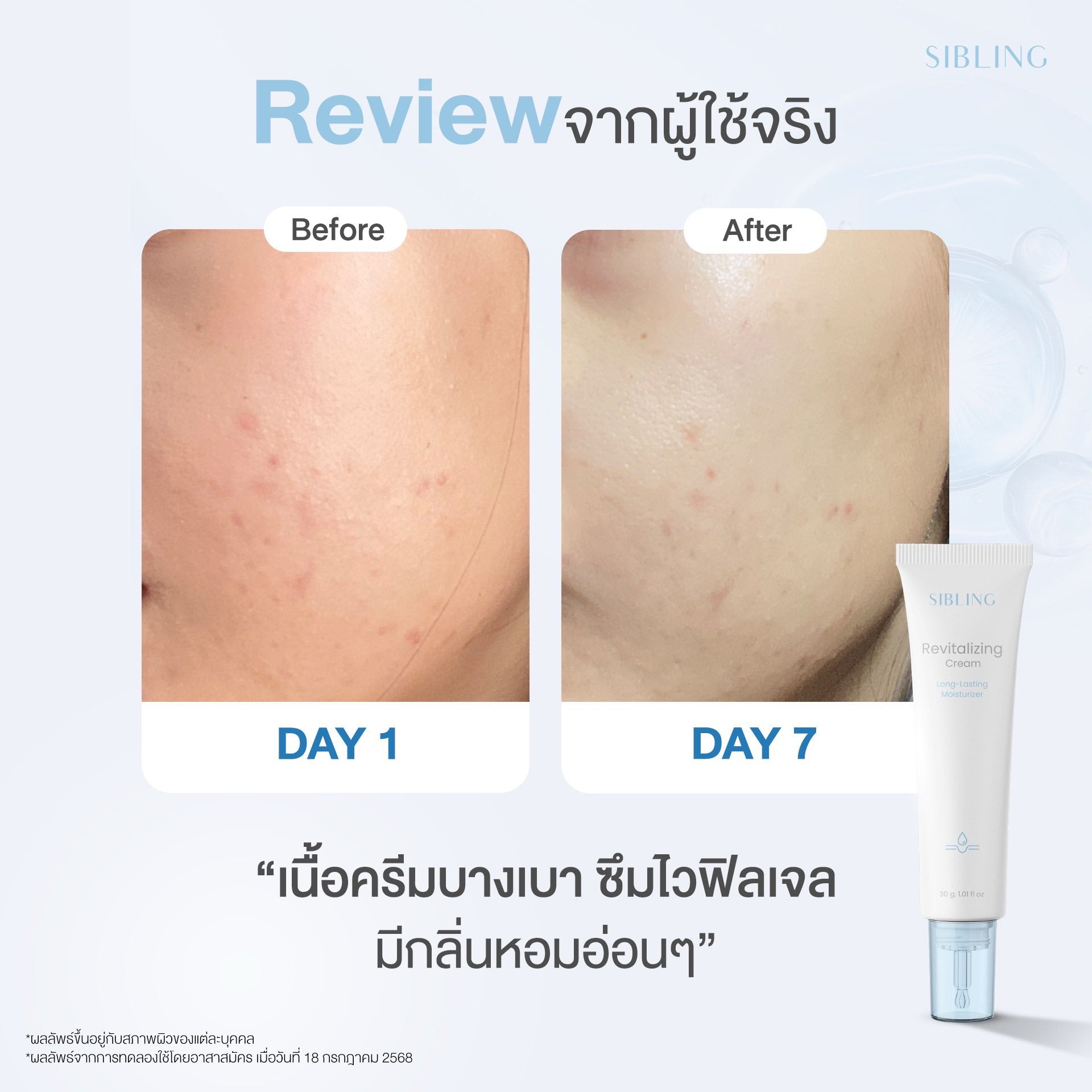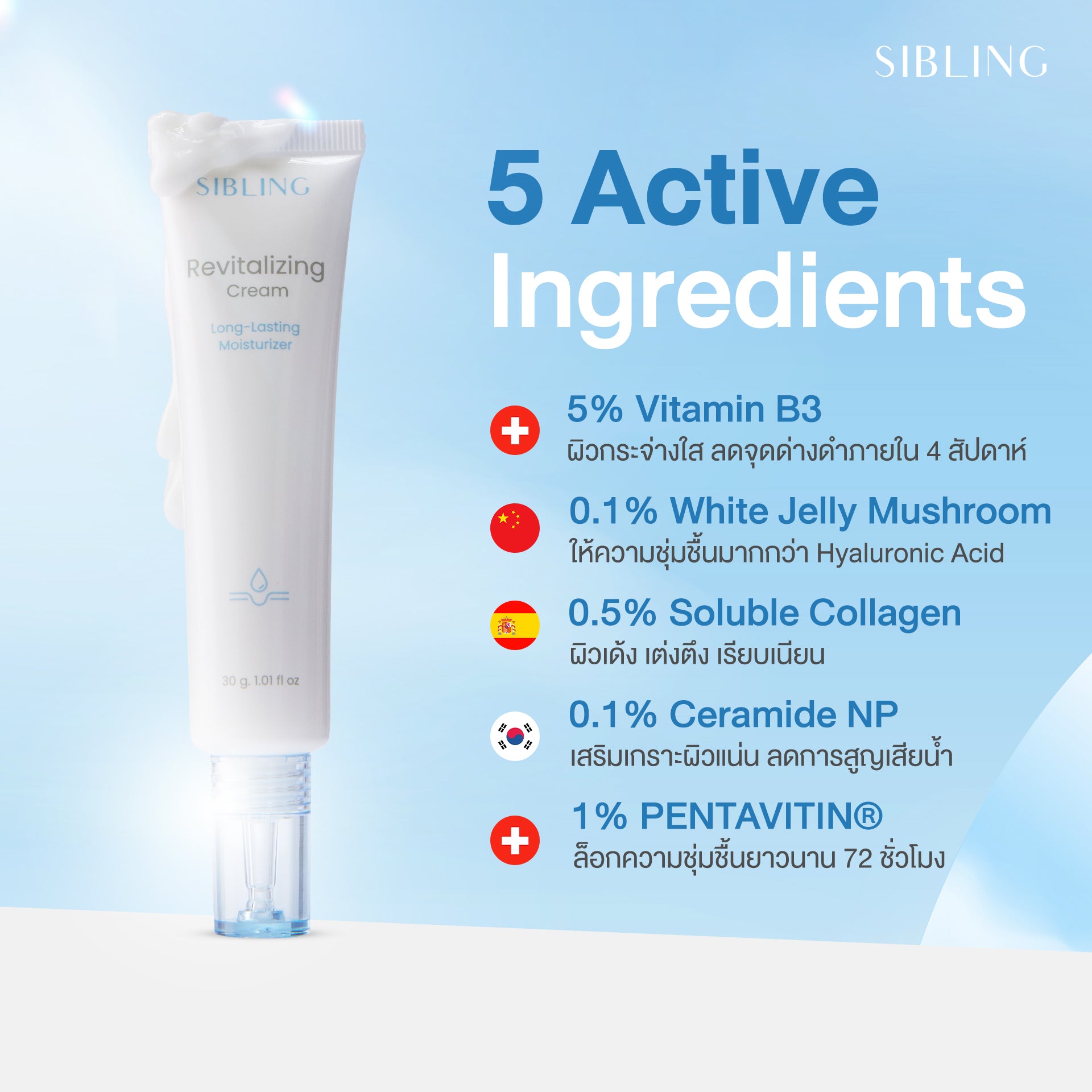 ซิบบลิ้ง รีไวทัลไลซิ่ง ครีม 15 กรัม มอยส์เจอไรเซอร์บำรุงผิวสูตรเข้มข้น มอบความชุ่มชื้นยาวนานสูงสุด 72 ชั่วโมง ด้วยส่วนผสมเซราไมด์ วิตามินบี 3 และซัคคาไรด์ ไอโซเมอเรท ช่วยเสริมเกราะป้องกันผิว ให้ผิวแข็งแรง ลดการระคายเคือง เนื้อครีมบางเบา ซึมเร็ว ไม่เหนอะหนะ เหมาะกับทุกสภาพผิว