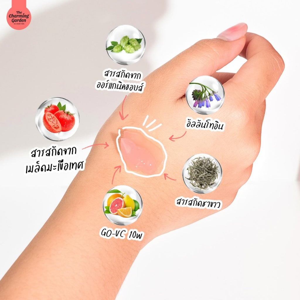เดอะ ชาร์มมิ่ง การ์เด้น โทเมโท รีไวทัลไลซิ่ง เจล (50 กรัม) เจลบำรุงผิวหน้าสูตรเข้มข้นจากสารสกัดเมล็ดมะเขือเทศ ออร์แกนิคฮอบส์ ชาขาว อัลลันโทอิน และ GO-VC 10w ฟื้นฟูผิวหมองคล้ำ ให้กลับมาดูสดใส เปล่งปลั่ง เนื้อเจลบางเบา ซึมง่าย ไม่เหนียวเหนอะหนะ เหมาะกับทุกสภาพผิวแม้ผิวบอบบาง